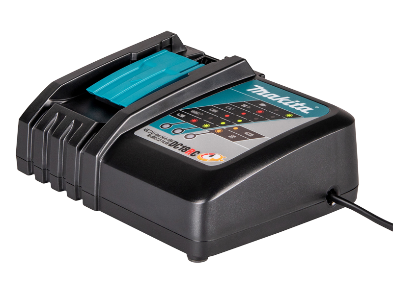 Cargador rápido para baterías de 14,4V y 18V LXT® de tipo deslizante. Equipado con un ventilador que enfría la batería para permitir una carga más rápida. Carga optimizada en términos de tensión, corriente y temperatura. Carga una batería en 15-55 minutos, dependiendo de la capacidad de la batería.