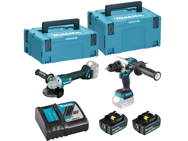 El kit incluye taladro combinado sin escobillas DHP486 y miniamoladora angular DGA504. Dos baterías de 5,0 Ah y cargador rápido en maletines Makpac. Una gama completa de dos máquinas para uso profesional.